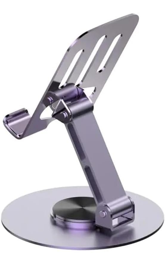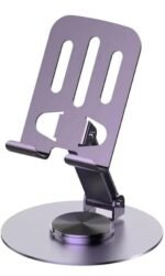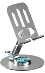 - VERSATILE DESIGN: Adjustable mobile phone stand with wooden 360° rotating base and foldable arms provides versatile viewing angles for hands-free use.