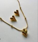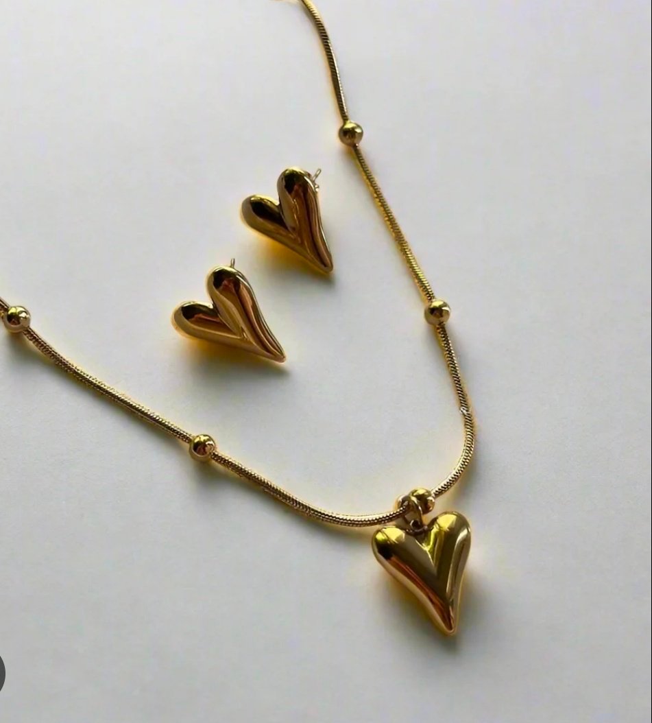Anti-Tarnish This Gold Puffy Heart Jewelry Set features a high-polish, three-dimensional heart pendant paired with matching stud earrings. The standout feature is the beaded snake chain, which adds a textured, premium feel compared to a standard plain.