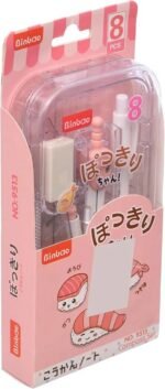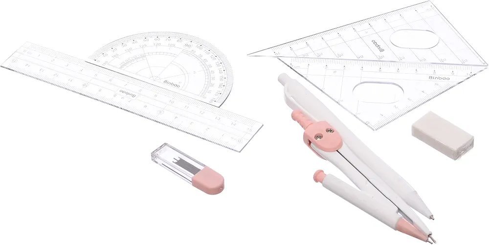 Compass with Built-in Mechanical Pencil, Ruler, Protractor, 2 Triangles, Mechanical Pencil, Eraser and Pencil Leads Box) – White Pink
