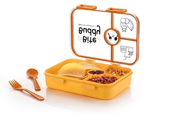 Bite Buddy Lunch Box bite into Happiness 4compartment, 2 flip Lock & Spoon, Reusable Microwave Freezer Safe (Multi)