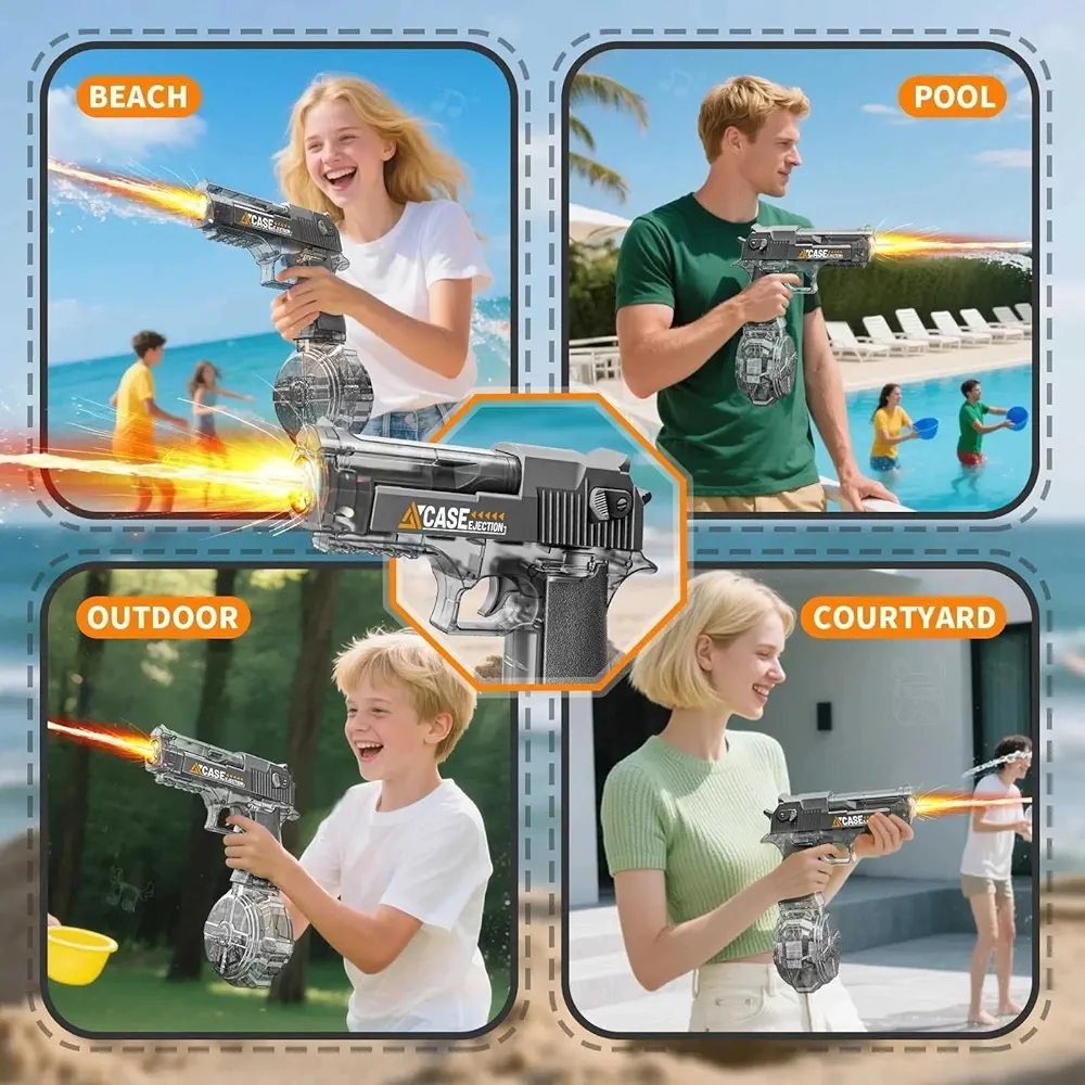 ATTRACTIVE DESIGN: This Gatling water gun is not only a great performer, but also has a beautiful design. The gun is adorned with lights that flash when the trigger is pulled, providing an engaging and exciting visual experience for young users.