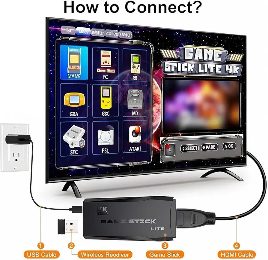 Plug the Game Stick Lite into your TV via HDMI/AV, connect power with Micro USB, insert the USB receiver, and turn on controllers. Select the input source, navigate with the Direction pad, press Start to play. No internet needed—20,000+ retro games ready instantly for 1–2 players.