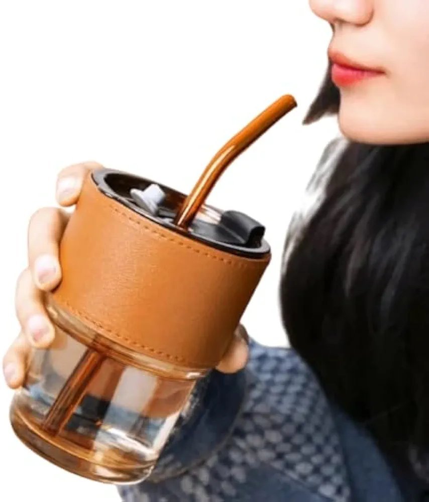 Leather Grip Coffee Cup Sipper Glass with Straw Grip,Glass Bottle Straw Glass Tumbler (430 ml)