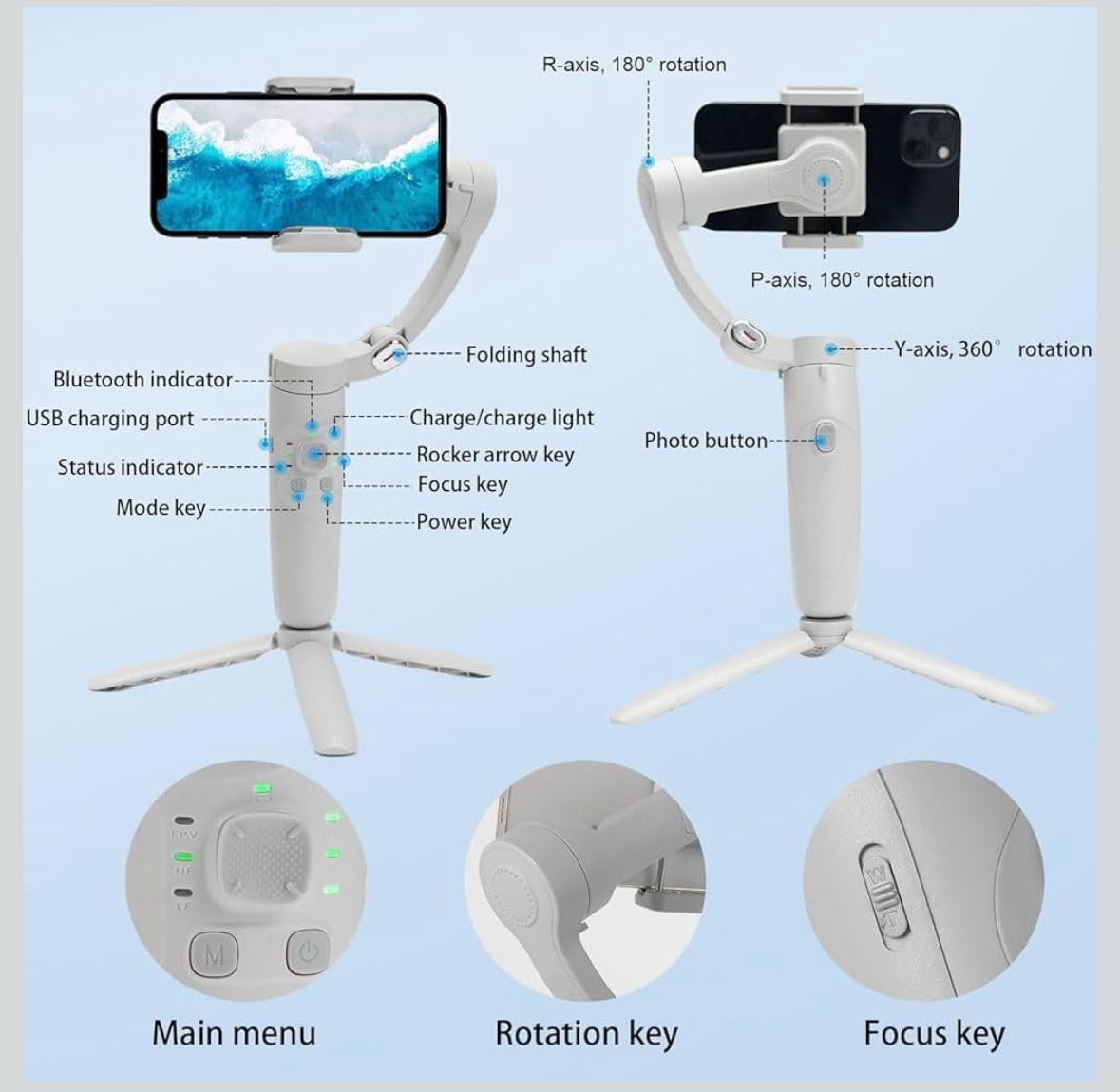 “M1 Gimbal offers ultra-smooth videos, Bluetooth control, 180° rotation, magnetic fill light, and tripod support for all creators.”