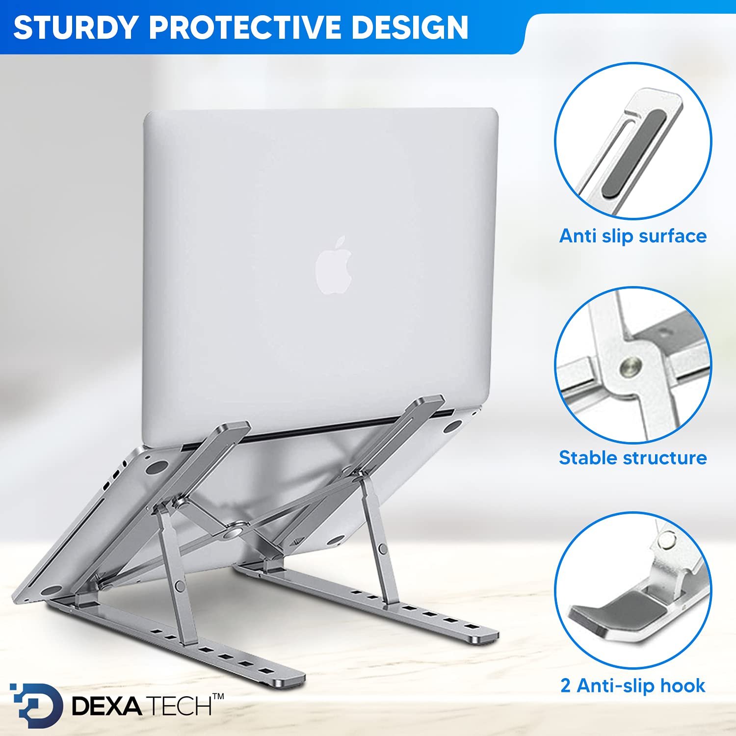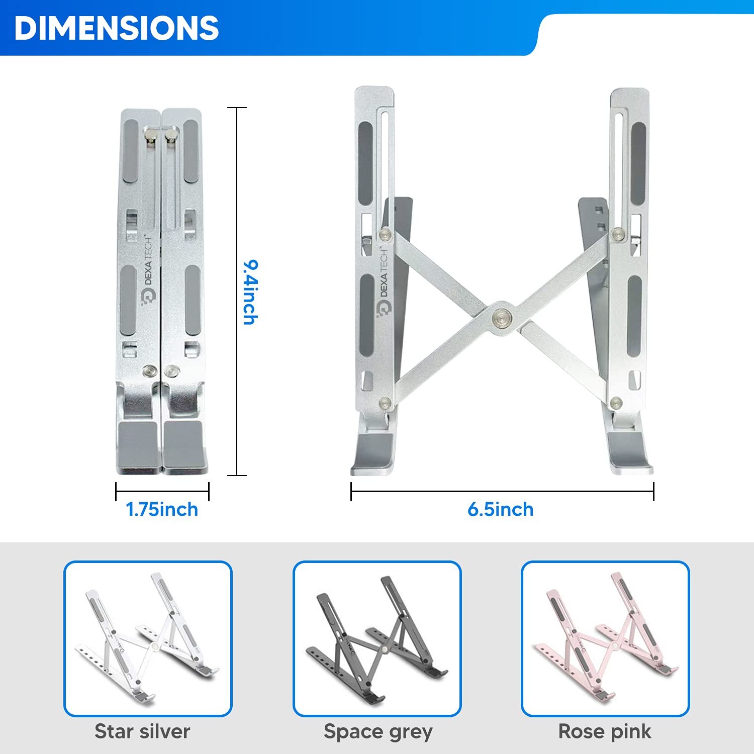 - 💻 Ultimate Laptop Raiser: With a polished sleek surface and three colors to choose from, the DEXA TECH laptop stands are the perfect addition to your work from home accessories. You can trust these durable and resilient Aluminum Alloy holders to withstand the load of your gadgets with ease.