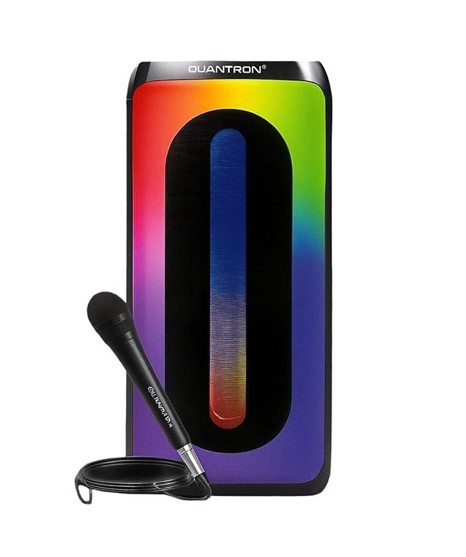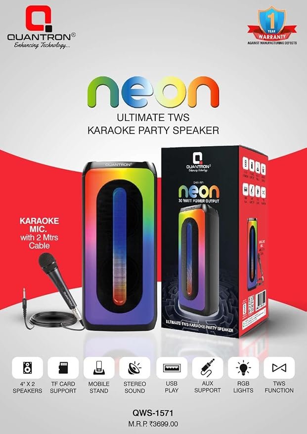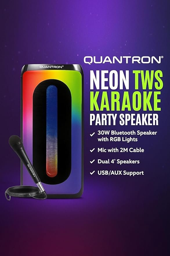 QUANTRON Neon TWS Karaoke Party Speaker | 30W Bluetooth Speaker with RGB Lights | Mic with 2M Cable | Dual 4″ Speakers | USB/AUX Support