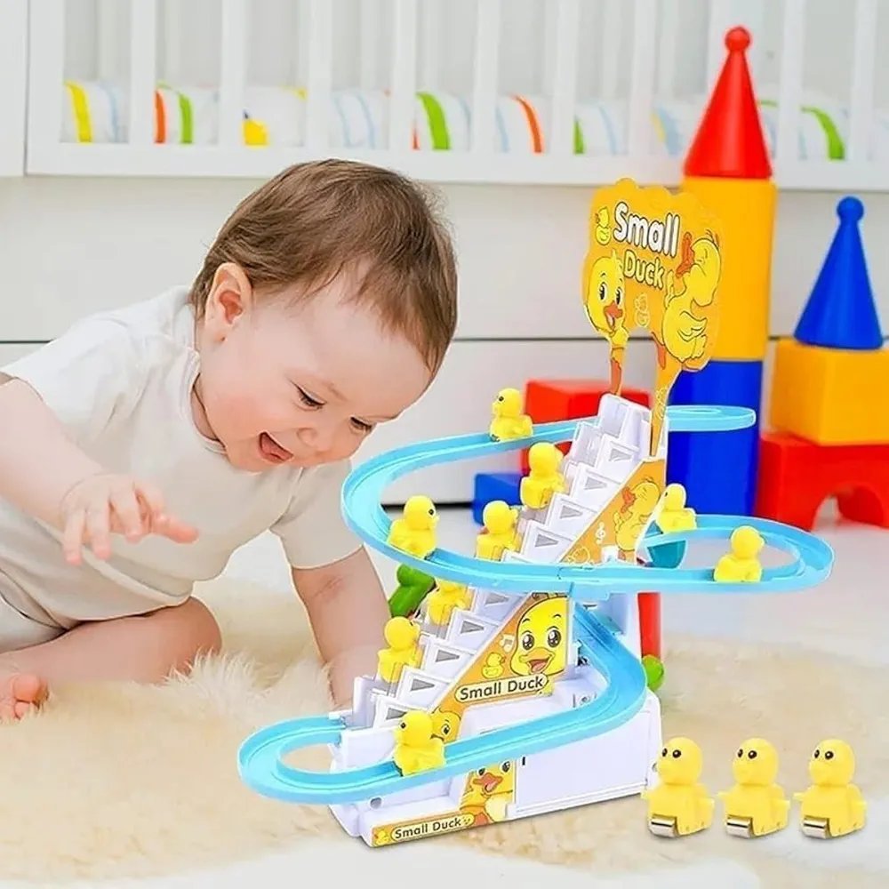Bring a world of fun and music to your child’s playtime with the Small Duck Climbing Stairs Toy. This delightful, battery-operated playset features three adorable ducks that automatically “climb” the escalator and zip down the winding blue track in a continuous, hypnotic loop.