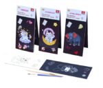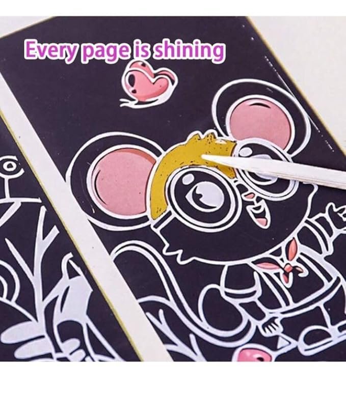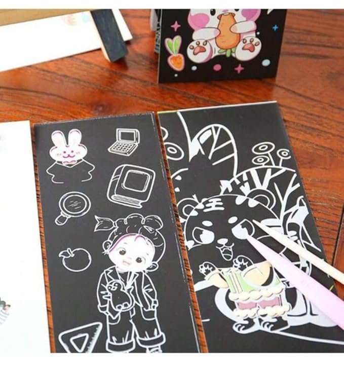 - 8 pages scratch book + 8 page color book + dry color palate + 1 scratch tool