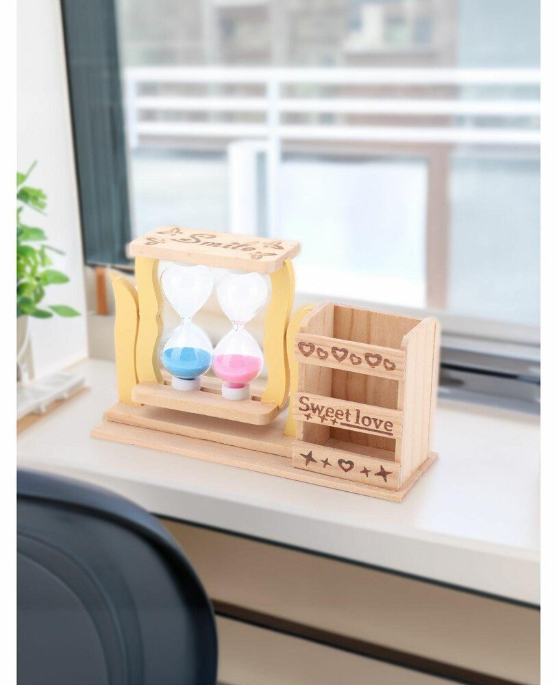 Sturdy Base: Both the hourglass swivel and the pen pot are mounted on a single, smooth wooden platform for stability on a desk or shelf.